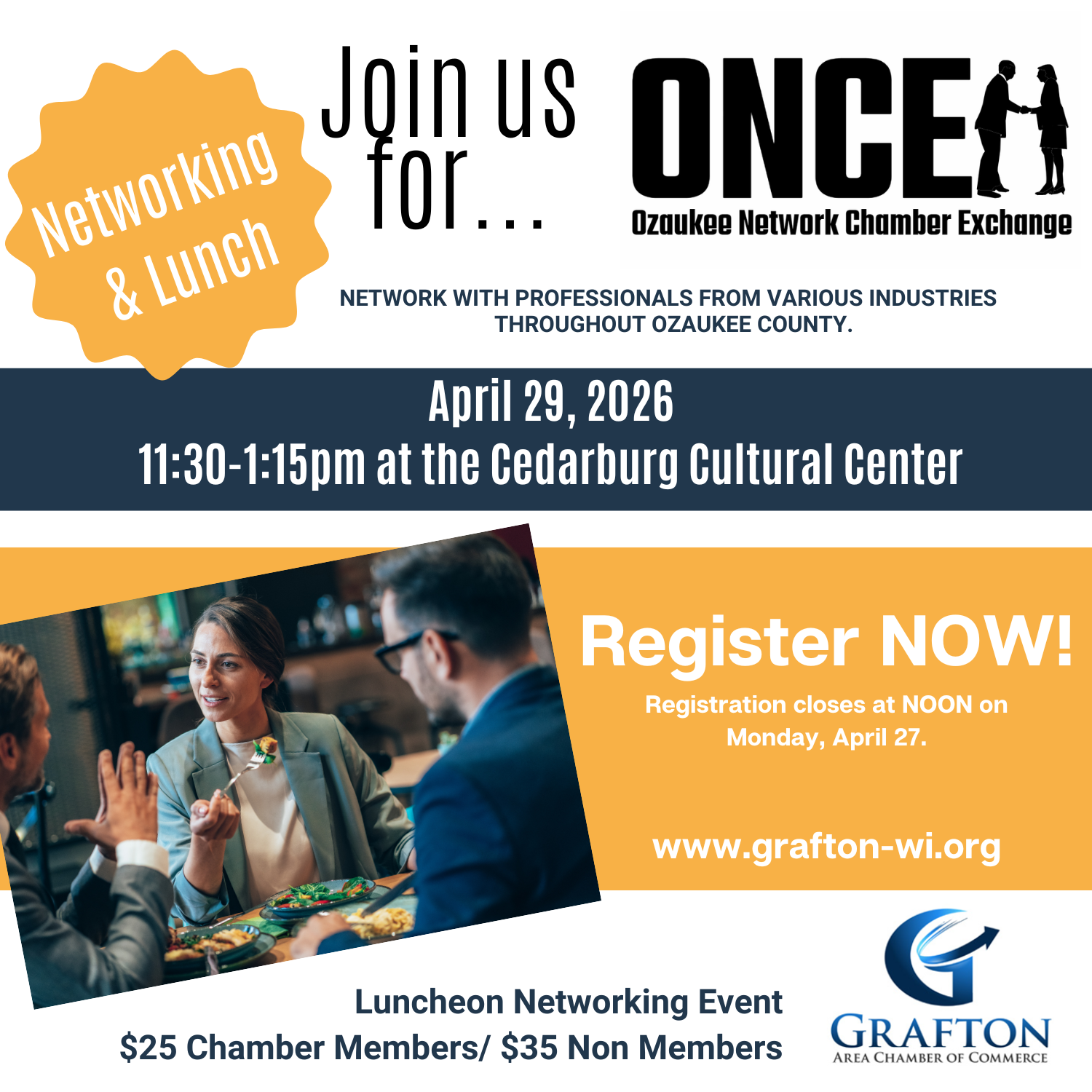 Join us to network with members of Chambers from throughout Ozaukee County! Share your business details and build leads while networking during a catered lunch. We encourage you to invite a non-chamber member to join you, so they can see what an effective networking event in Ozaukee County can do for their business.